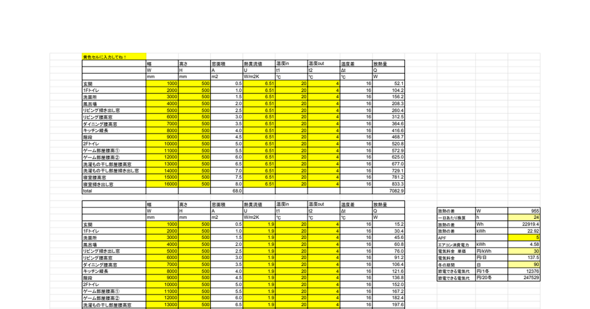 計算の仕組みがわかったら、我が家の窓をリフォームした時の条件にあてはめてどれだけの放熱量になるかが推定できます。
