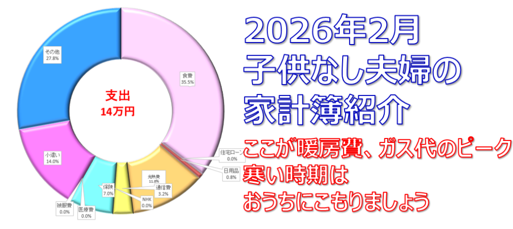 先月の様子は【2026年1月】子供なし夫婦の家計簿公開 支出16万円をご覧ください。